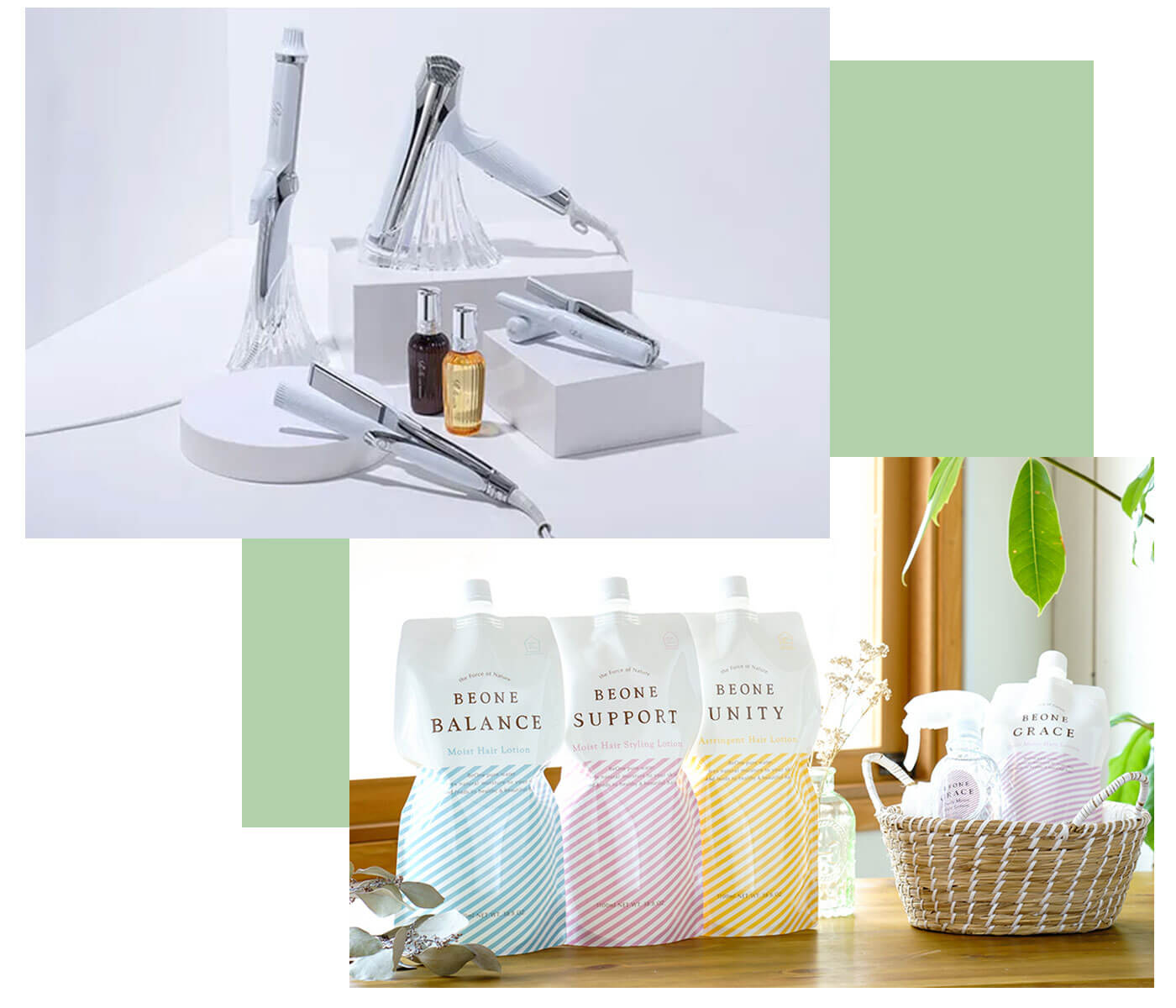 LOOPでは髪や地肌のうるおいや健康を最大限に考え、ドライヤーにReFa、ケア製品にBEONE製品を使用しております。